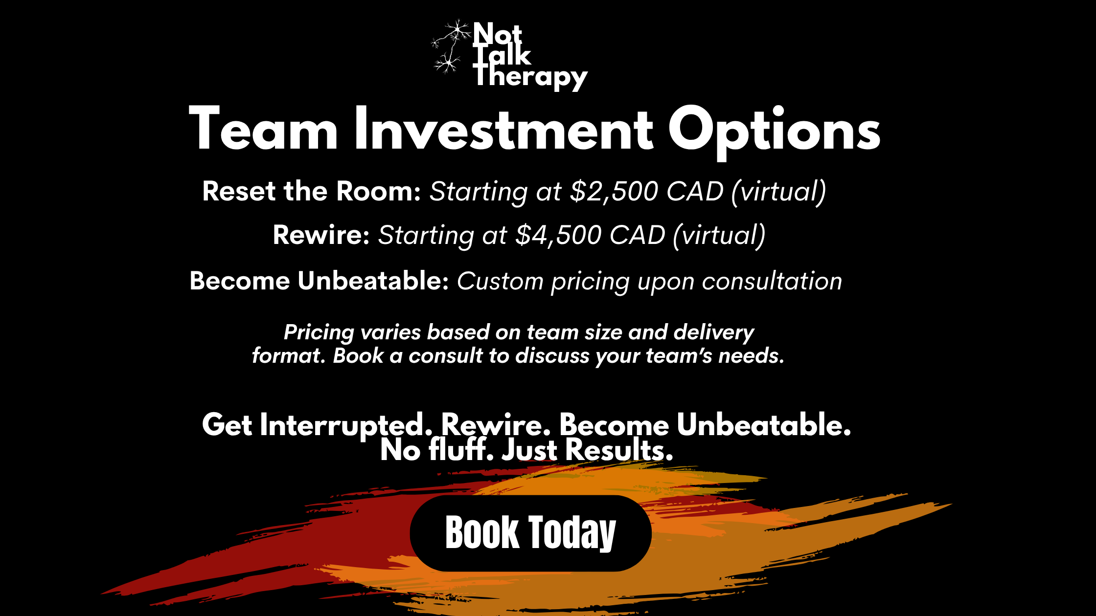 These intensives are designed to create a measurable shift in your team’s performance under pressure. Investment reflects the expertise, preparation, and post-session integration required to ensure results.